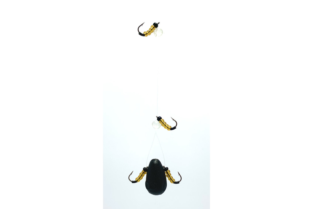 Оснащена вантажем масою 8г., з пропускним силіконовим кембриком для запобігання перетиранню флурокарбону й тим самим – продовження терміну служби принади. 4 якісними гочтрими японськими гачками 12 розміру, на гяких встановлено бісер, що імітує природний кормовий об'єкт.
